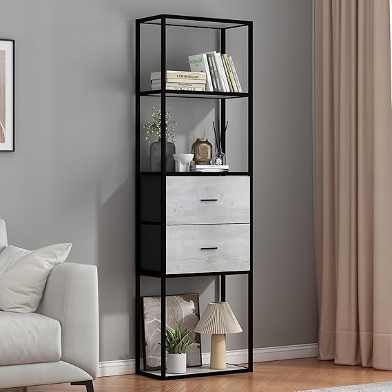کتابخانه مدرن ترکیب ام دی اف و فلز 5 طبقه کشودار دو رنگ مشکی بلوطی | رنگ بندی دارد