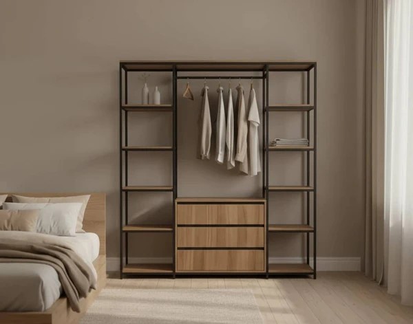 کمد کلوزت مدرن جا دار و کشو دار چوب و فلزی رنگ قهوه ای تیره | رنگ بندی دارد
