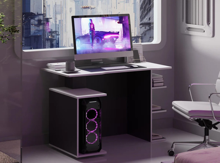 میز مدرن ترید و گیمینگ طرح چوب ام دی اف با 3 قفسه دو رنگ ترکیبی سفید مشکی | رنگ بندی دارد