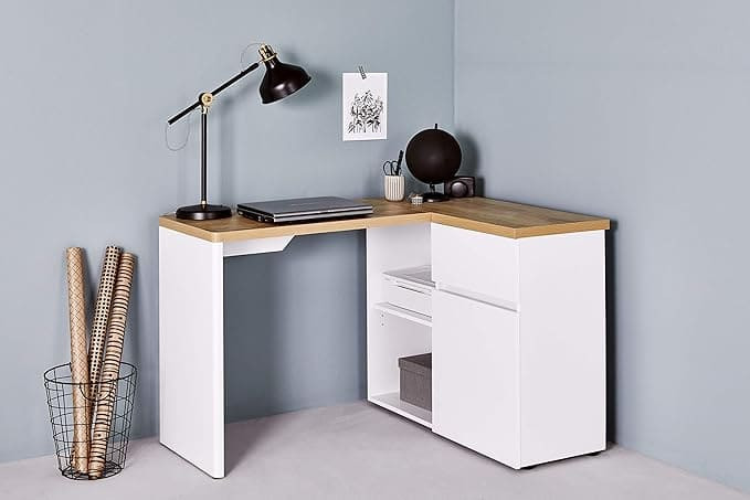 میز کار گوشهای با طراحی فشرده و قفسه چند منظوره